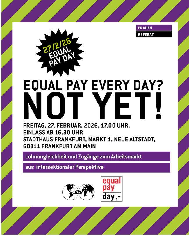 Im Fokus steht die Frage, warum die Lohnlücke insbesondere mehrfachbenachteiligte Frauen trifft. Beispielweise durch Diskriminierung aufgrund von Geschlecht, Herkunft, Care-Verantwortung, prekärer Beschäftigungs- und Lebensverhältnisse oder Erwerbsunterbrechungen. Thematisiert werden Zugänge zum Arbeitsmarkt, strukturelle Ausschlussmechanismen und die Bedingungen, unter denen Erwerbsarbeit möglich ist. Zugleich richtet sich der Blick auf die stärkende Kraft von Netzwerken und Bündnissen und auf Chancen und Handlungsspielräume. Grußworte sprechen Frauendezernentin Tina Zapf-Rodríguez, Frauenreferatsleiterin Gabriele Wenner und Anna Zimmermann, Vorstandsvorsitzende BPW Frankfurt. Im Programm: Keynote, Podiumsgespräch und Vernetzung. Eine Veranstaltung vom Frauenreferat und dem Business Professional Women e.V. Frankfurt (BPW).
